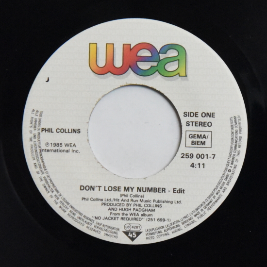 | Levy | Collins, Phil : Don’’t Lose My Number (Edit) / We Said Hello Goodbye | Myyntihinta | 2.30 € | Tarjoushinta | 1.61 € | Kuvaus | na/Ex- | Toimituskulut | 5.00 € | Kunto, kannet/vinyyli | 4/8 | Levymerkki | WEA | Julkaisuvuosi | 1985 | Numero | 259 001-7 | Valmistusmaa | Germany | Muuta | Lisätty rekisteriin | 05.11.2020 | ![]() |
